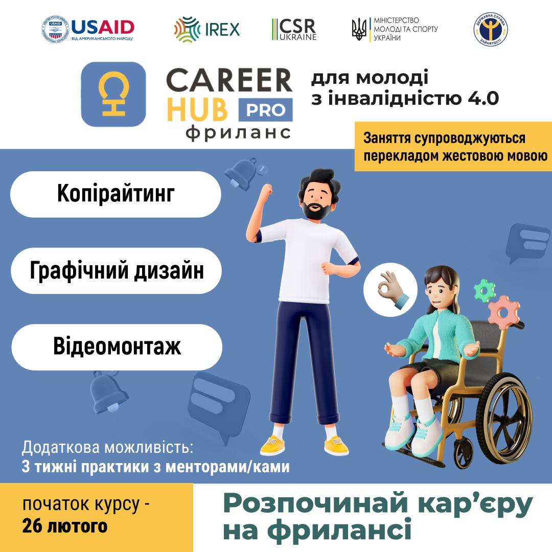 26 лютого стартують освітні онлайн-курси з опанування креативних професій “Сareer Hub Pro: Фриланс для молоді з інвалідністю” (копірайтинг, графічний дизайн чи відеомонтаж).